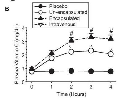This being the case, it is possible to take more of the Liposomal C then regular C without bowel issues. Which means, you are also able to raise your blood levels more effectively. This is shown in the graph above in the side bar, taken from a study where they tested the same dose of straight Vitamin C (Un-encapsulated) against Liposomal Vitamin C (Encapsulated) for their ability to raise levels of Vitamin C in the blood.